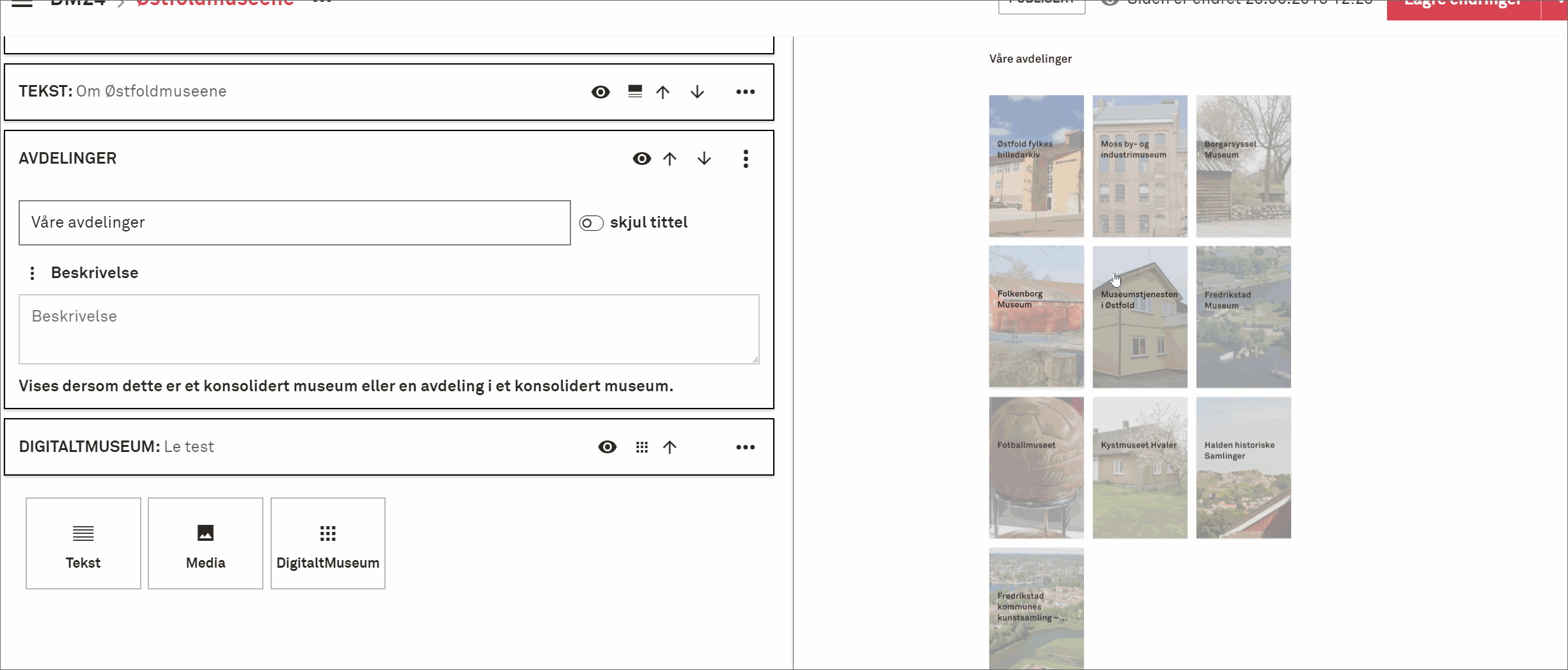 Like the search collage block, this block can only be switched on or off. You can either delete the block or set its status to "Not Visible". To do so, click the "eye"-icon and select "show" or "hide". If visible, and the museum is an organization consisiting of more than one museum, it will list out all the museums in the organization.