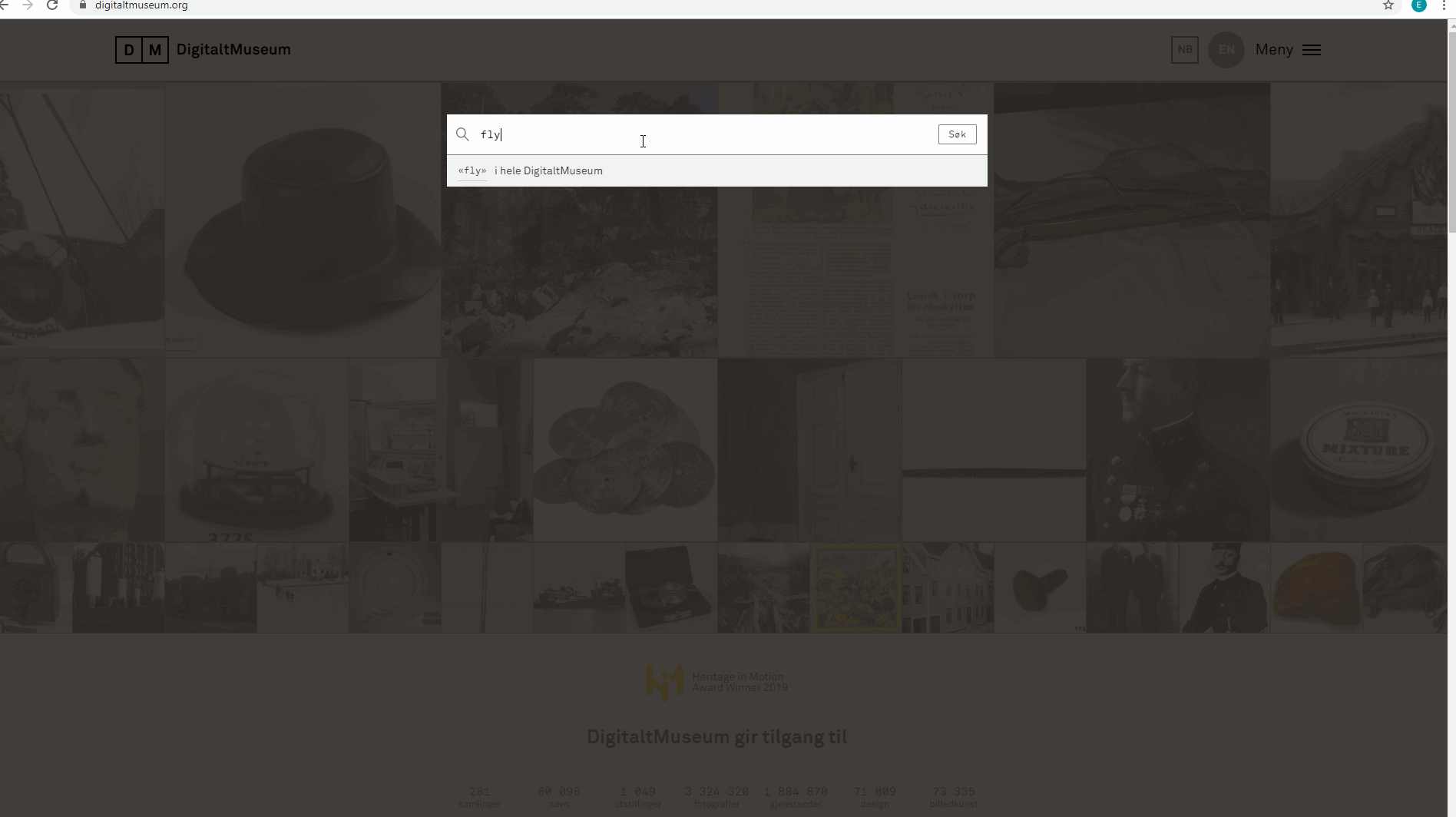 If you perform a search from a presentation page of one of the museums/institutions, your new search will automatically be restricted to this museum’s collections. From here, however, you are always able to choose to widen your search to include the entire DigitaltMuseum.