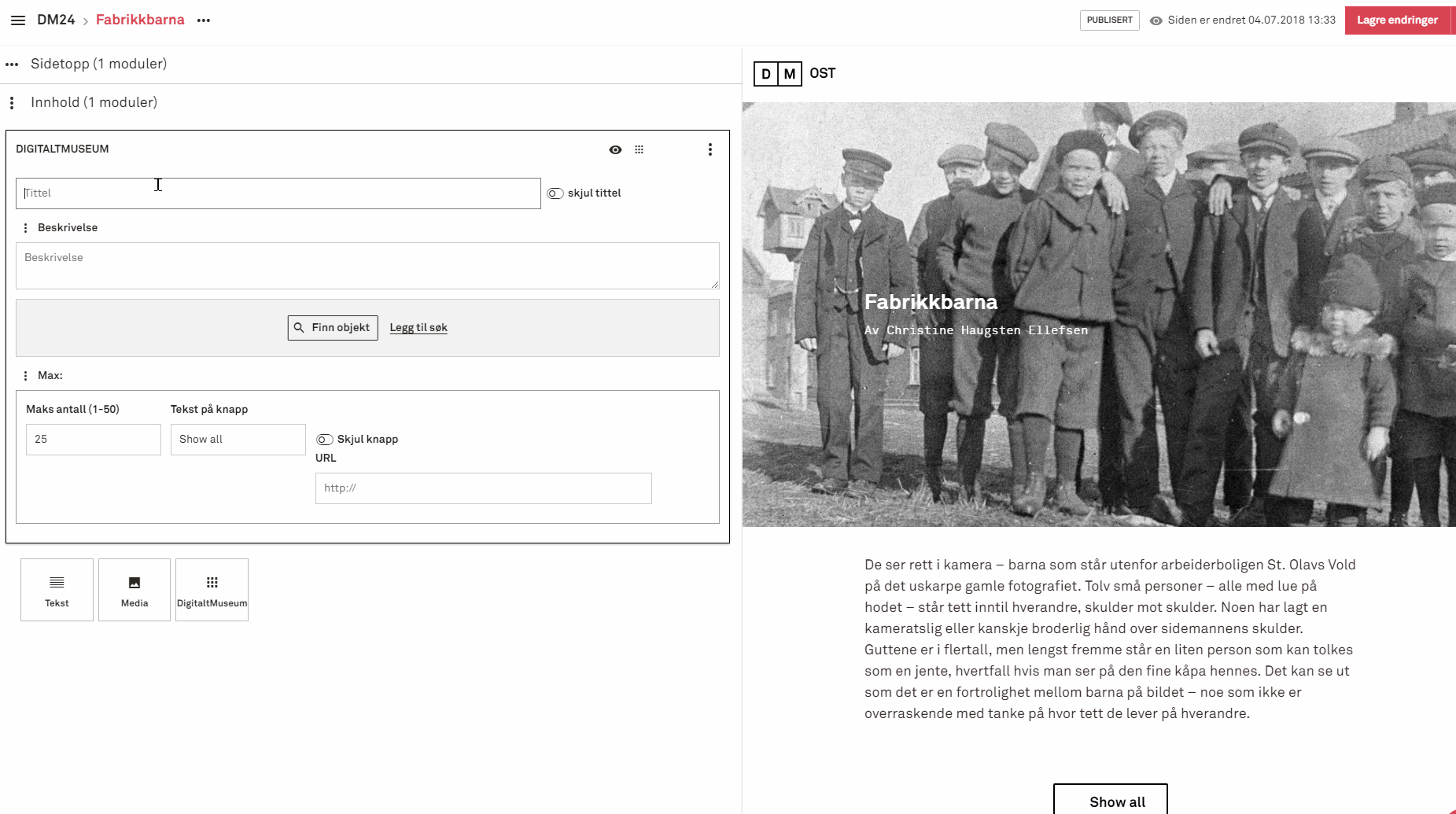 You can use the advanced search both in the finder, when picking single objects, and when setting up dynamic searches. The advanced search interface lets you limit the search results to your own museum and to an object type. As shown in the animation above, applying a filter using the interface will add the filter as a syntax in the search field. In this example we limit the search term "flyfoto" to Østfoldmuseen's collection and to only search in the object type folder. We then pick four folder objects and set their size.
