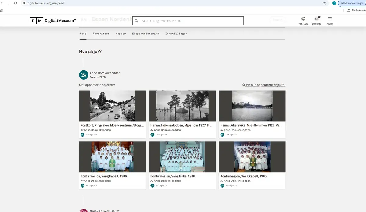 Første gang du besøker din profil, vil feeden være tom. Du kan som innlogget bruker imidlertid følge enkeltmuseer. Dette gjør du ved å besøke et museum på DigitaltMuseum og klikk på "Følg"-knappen. Du finner en oversikt over alle museer på DigitaltMuseum på https://digitaltmuseum.no/museums. Feeden din vil bestå av aktivitet fra de museene du har valgt å følge.
