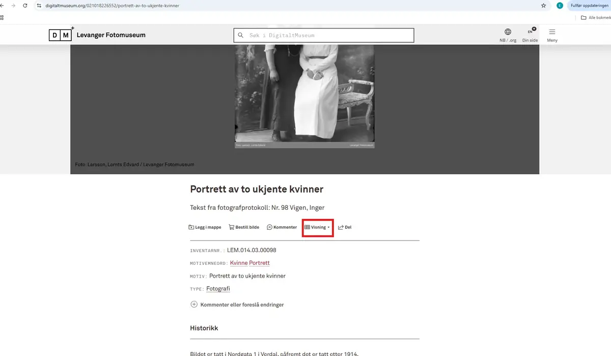 Alle objekter på DigitaltMuseum har en standardvisning der feltene kommer i en forhåndsdefinert rekkefølge. Dersom du har aktivert ekspertmodus, kan du imidlertid endre hvilke felt som skal være synlig og hvilken rekkefølge disse skal vises. Dette gjør du ved å besøke et objekt og velge knappen "Visning" som du finner i menylinjen under objektets tittel. Du vil da kunne velge hvor mange kolonner objektets metadata skal vises på og du kan videre klikke på knappen merket "Rekkefølge". I dialogboksen som kommer til syne, vil du kunne skru av og på feltene og "drag and drop" rekkefølgen på disse.
