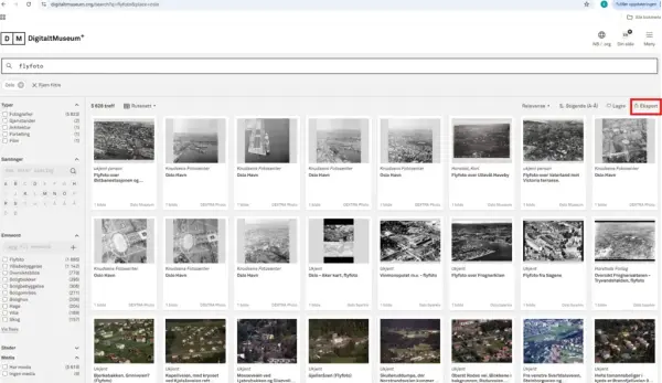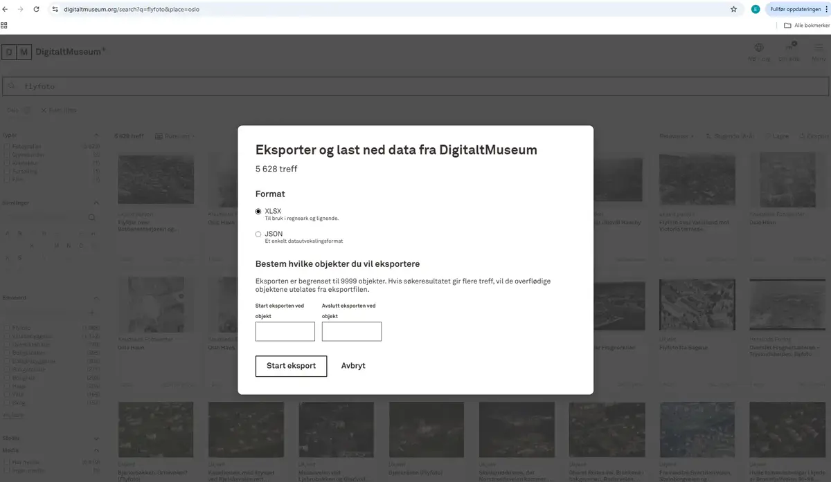Du kan eksportere søk, mapper og utstillinger til JSON-formatet eller regneark. Dette kan være nyttig for å ta ut oversikter over utvalg objekter som du kan bearbeide i et dokument.