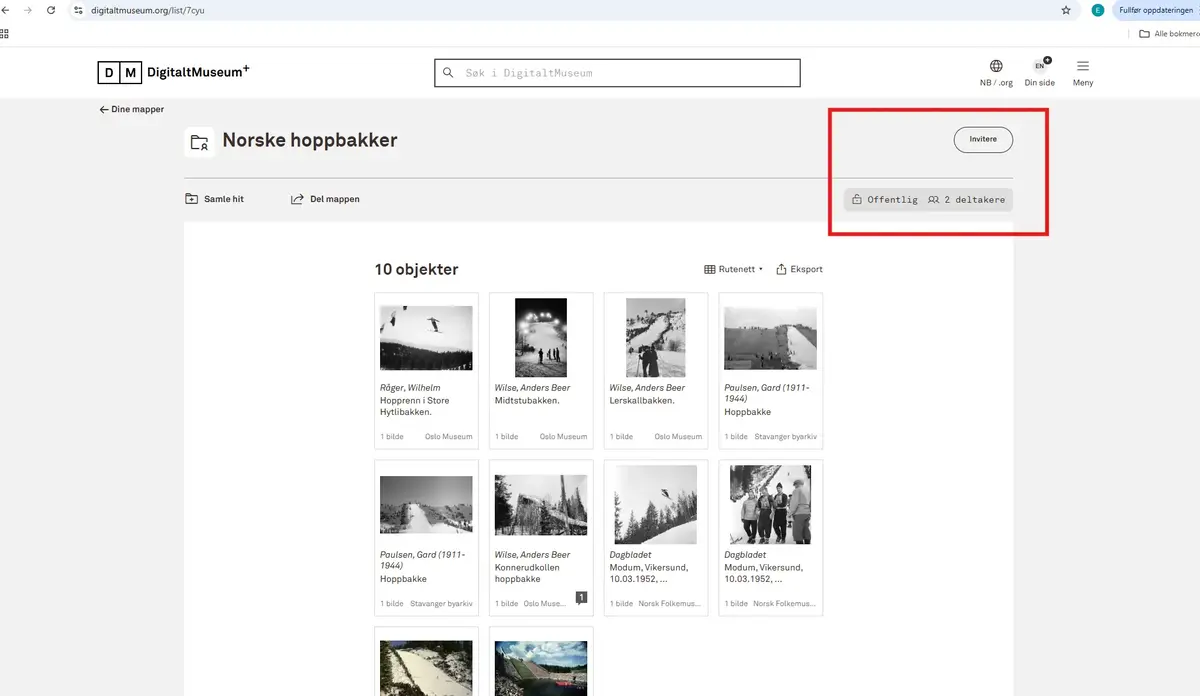 Du kan samarbeide med andre brukere på DigitaltMuseum om å samle innhold til mapper ved å skru på ekspertmodus og samtidig huke av for samarbeidsmapper fra din profils innstillinger. Fra en samarbeidsmappe kan du søke opp andre brukeres e-postadresser og velge hvilke brukere som skal få lov til å bidra med innhold til mappen. Videre kan du velge om vedkommende også skal få lov til å invitere inn andre brukere. Merk at alle som skal inviteres til å bidra i en samarbeidsmappe må ha skrudd på ekspertmodus og huket av for at de ønsker å være søkbare på DigitaltMuseum.