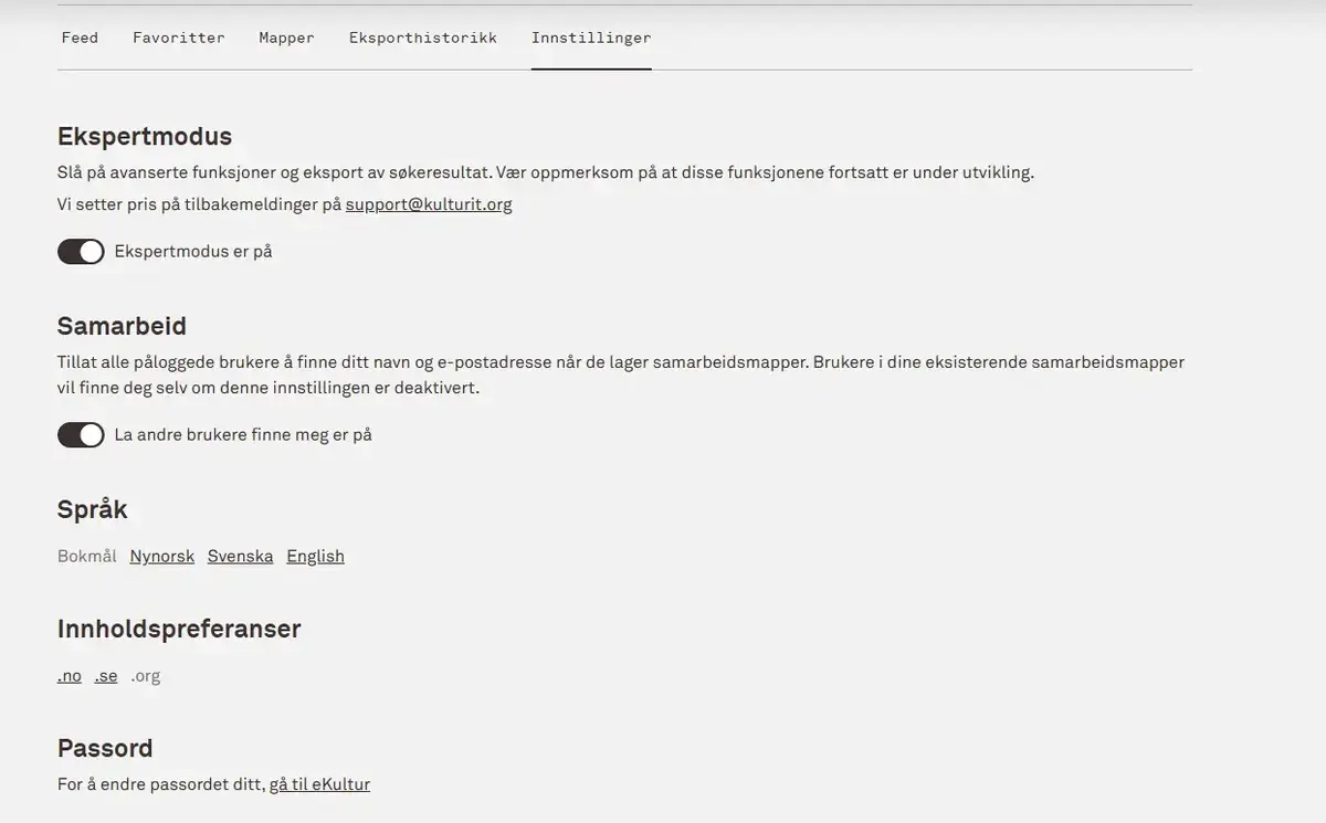 Herfra kan du skru på Ekspertmodus, velge om du ønsker at andre brukere kan finne deg på DigitaltMuseum for samarbeid om mappeinnhold, samt velge språk og sette nytt passord på din bruker.