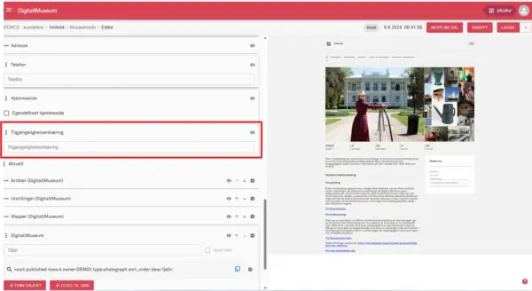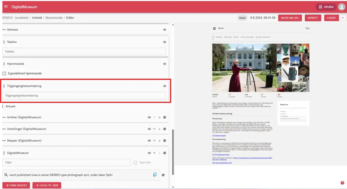 Lenken til den nylig opprettede erklæringen må videre publiseres til ditt museums hjemmeside på DigitaltMuseum. Det finnes et eget felt for dette i DigitaltMuseum admin. Dette finner du i hovedmenyen under punktene "Innhold" -> "Museumsside".